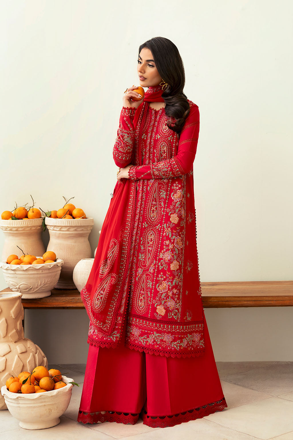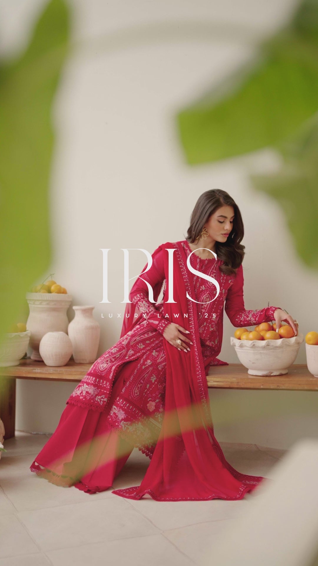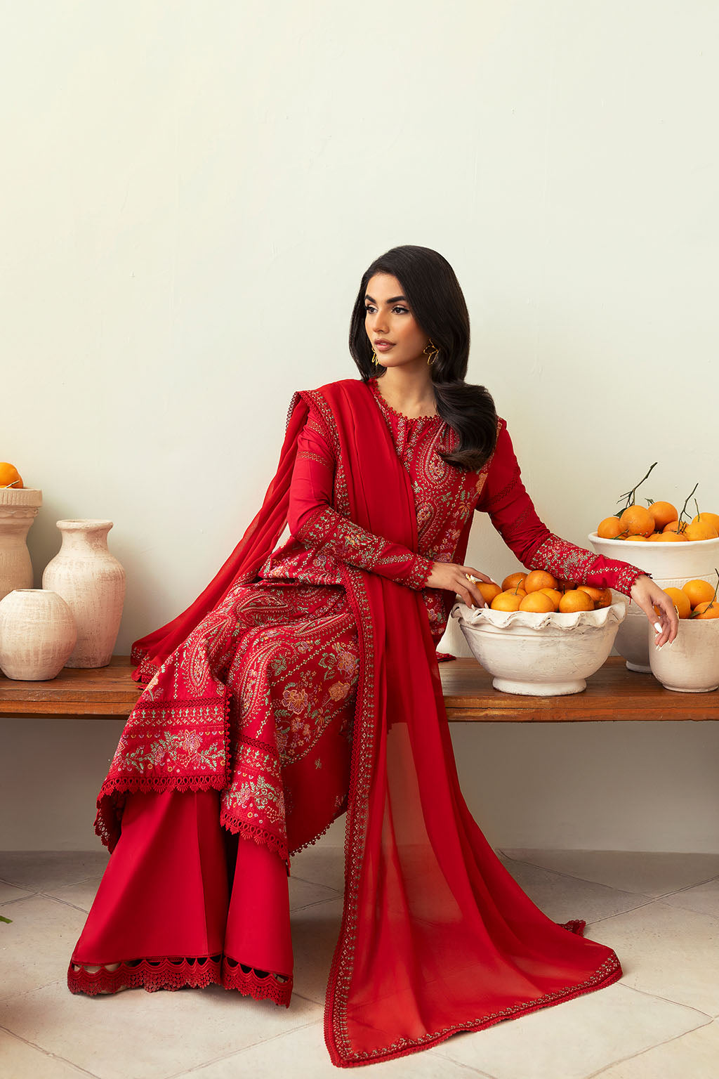 A deep blood red masterpiece featuring intricately embroidered panels, a detailed daman border, and a beautifully adorned chiffon dupatta with motif embellishments. Paired with a dyed trouser, this ensemble radiates sophistication and charm.