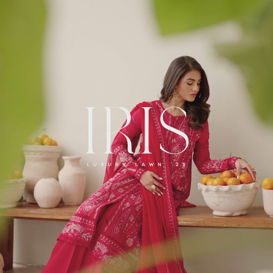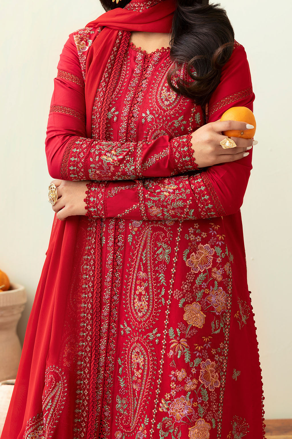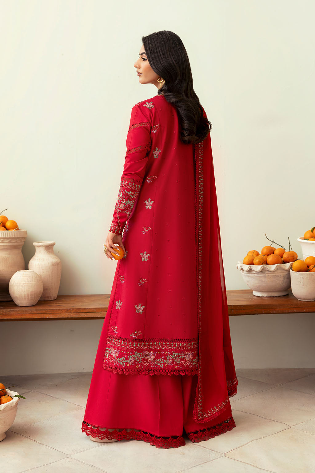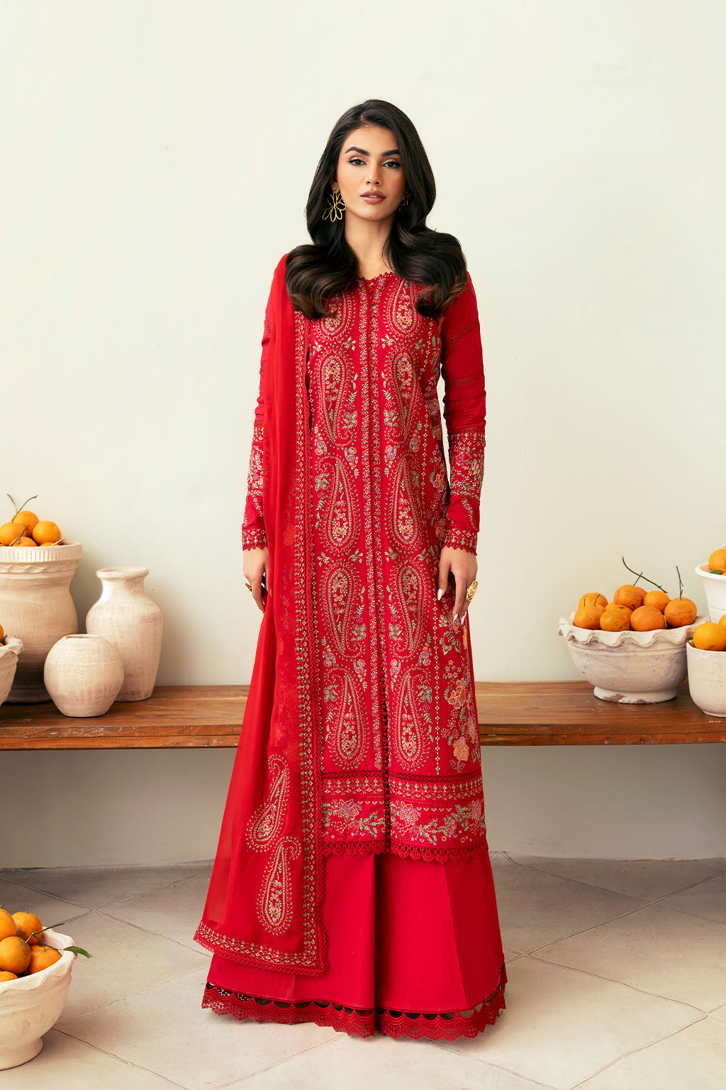 A deep blood red masterpiece featuring intricately embroidered panels, a detailed daman border, and a beautifully adorned chiffon dupatta with motif embellishments. Paired with a dyed trouser, this ensemble radiates sophistication and charm.