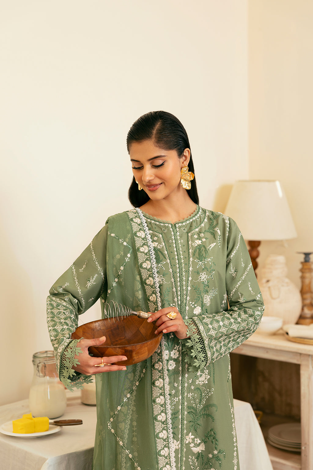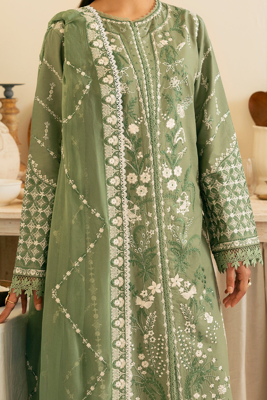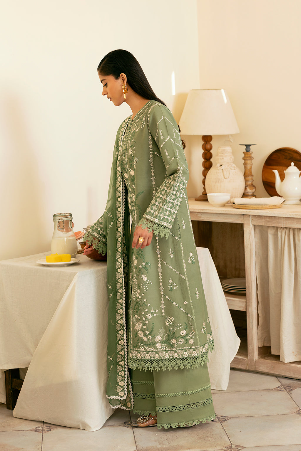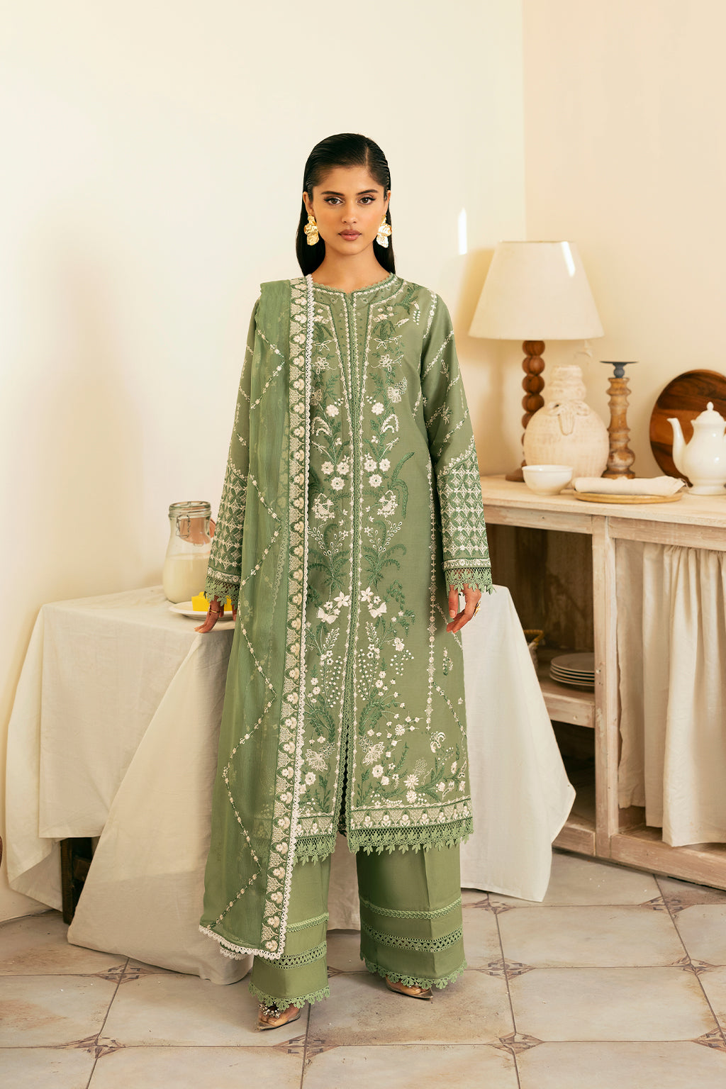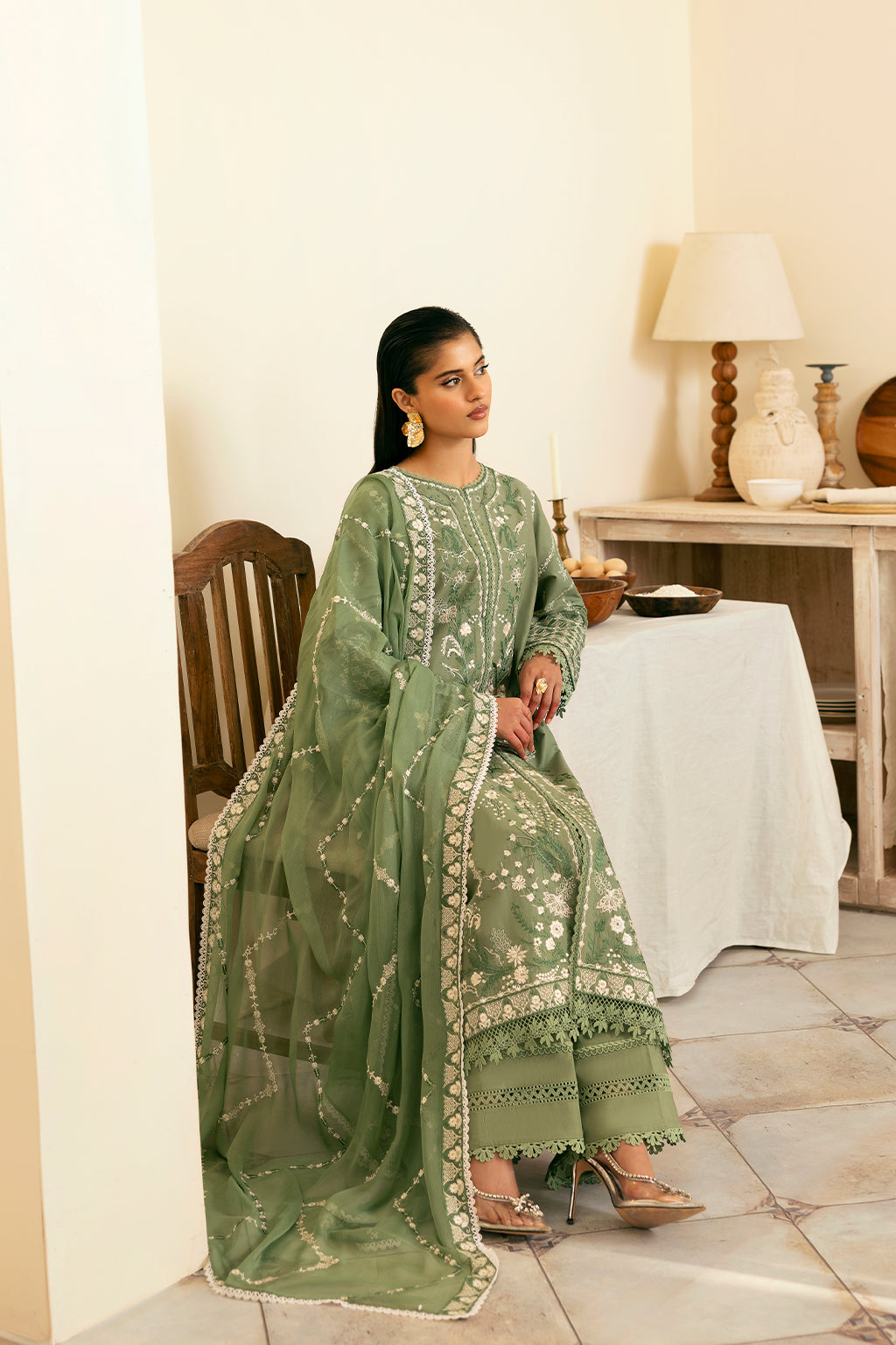 An ethereal sage green ensemble adorned with intricate embroidery on the front, back, and sleeves. Paired with a delicately embroidered chiffon dupatta and a dyed trouser, this design exudes effortless sophistication and timeless grace.