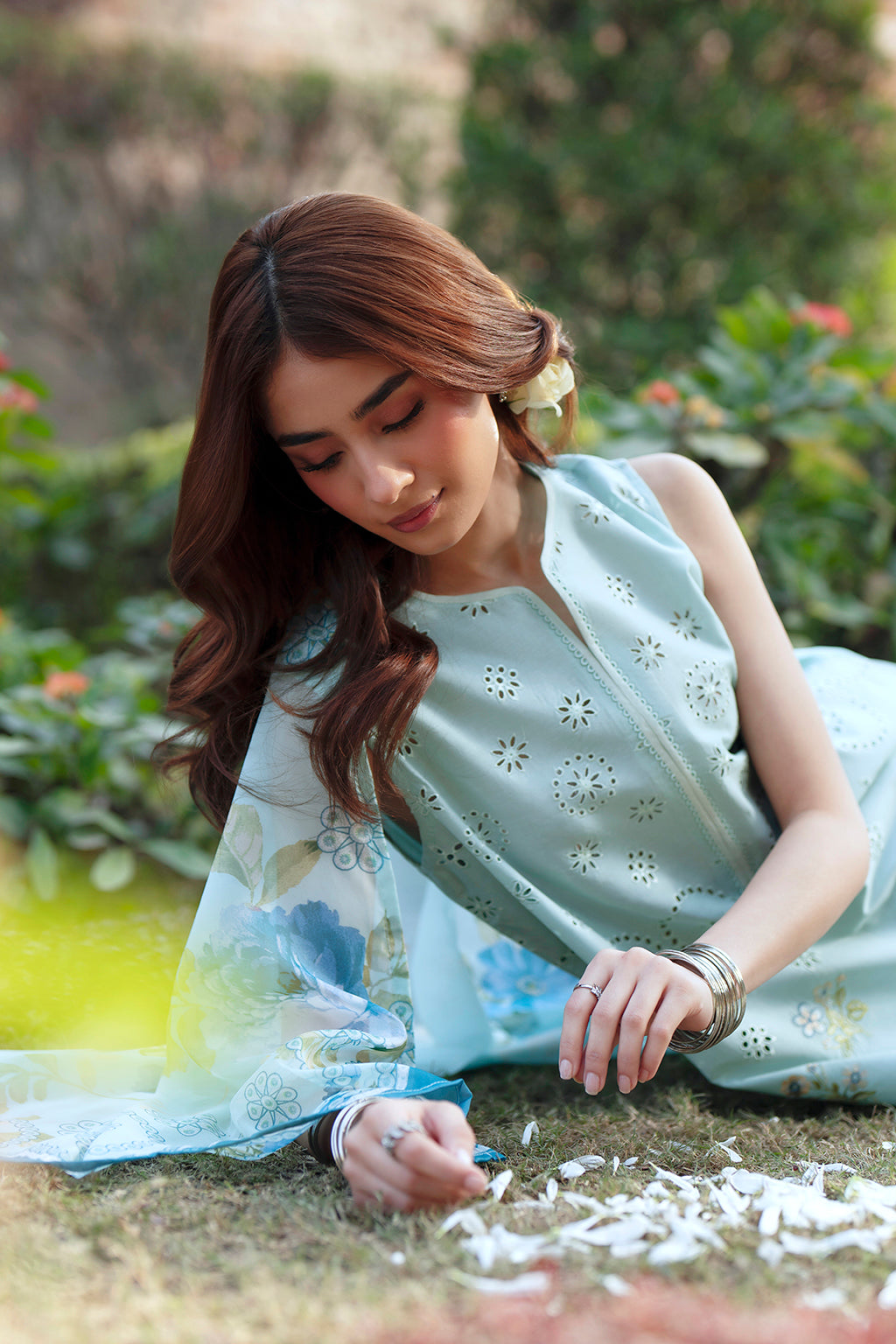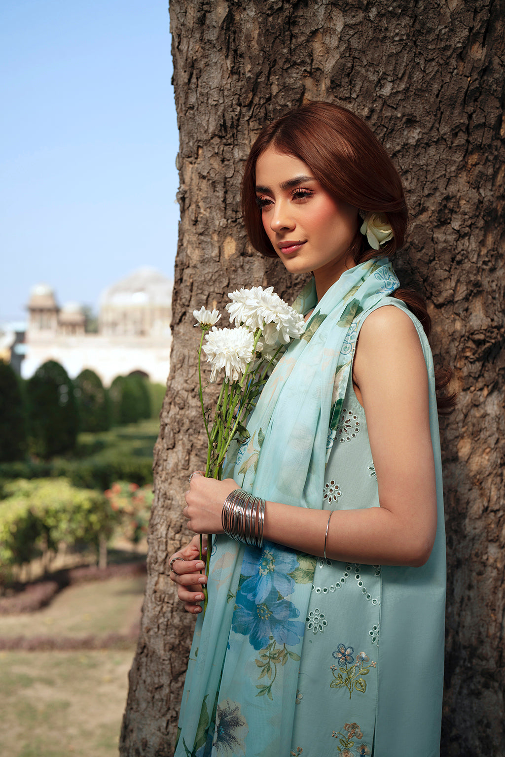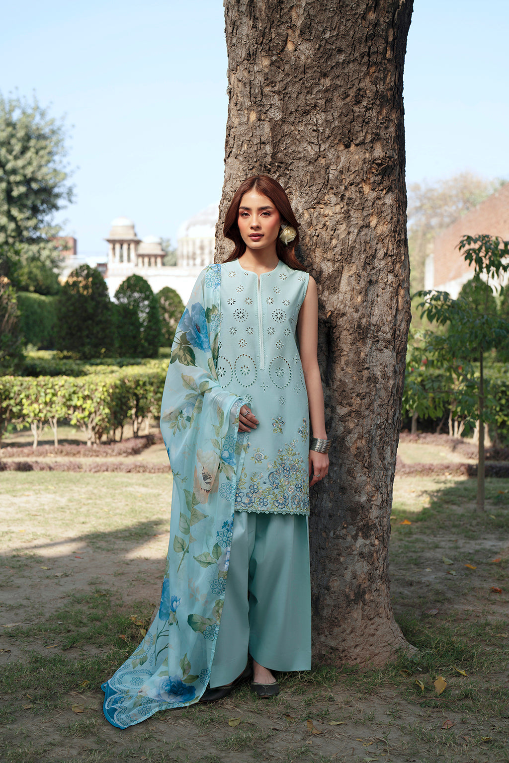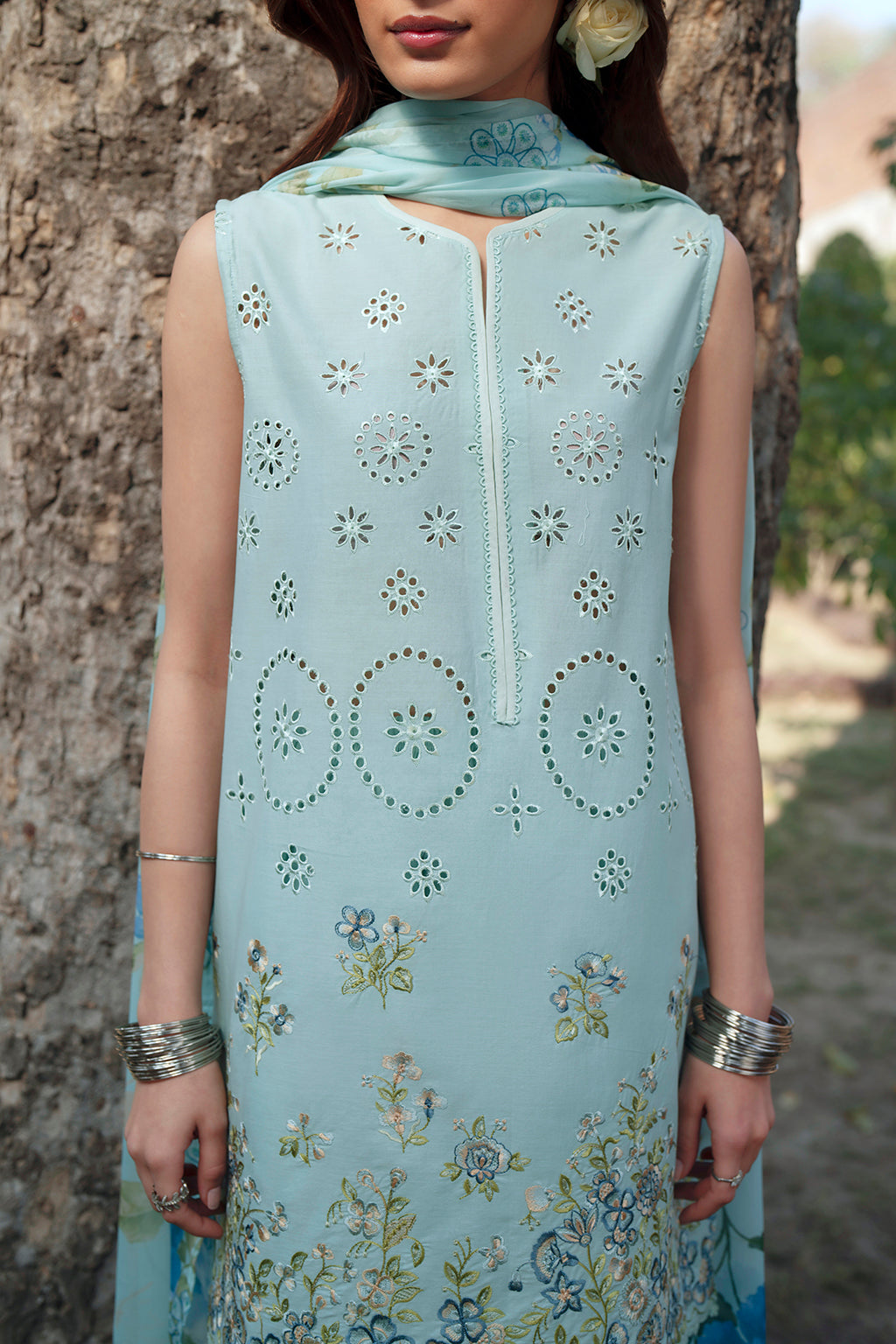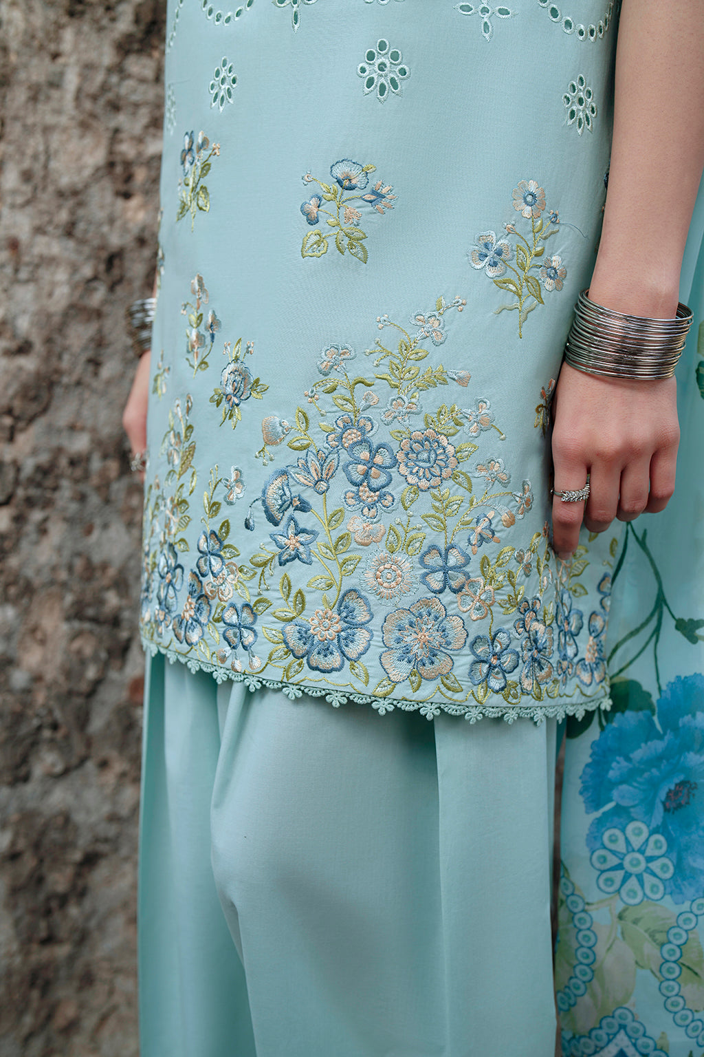 A cool mint-blue floral concept with clean embroidery that frames the front and sleeves neatly. The soft tones make this outfit calm and polished, while the silk dupatta adds elegance without overpowering the look.